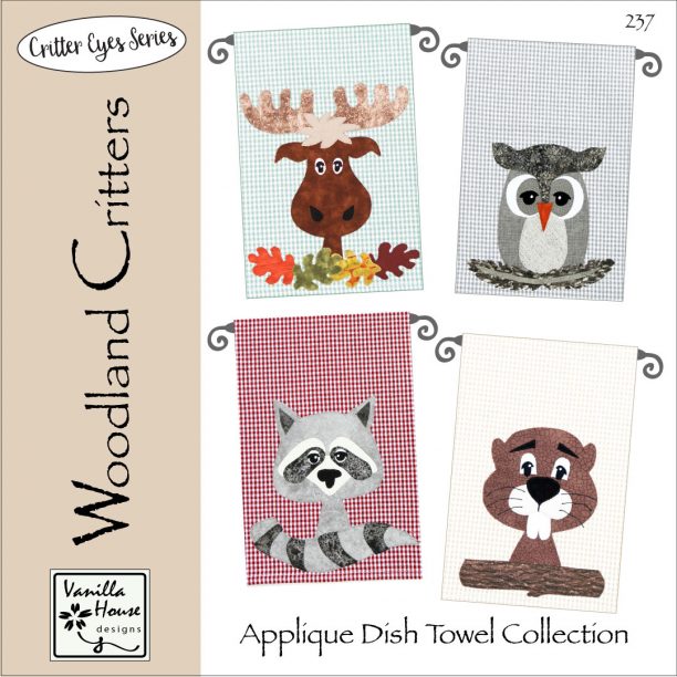 Forest Critters includes four appliques for your pre-purchased dish towels, each critter with a list of cute sayings. Great tips on the raw-edge applique technique.