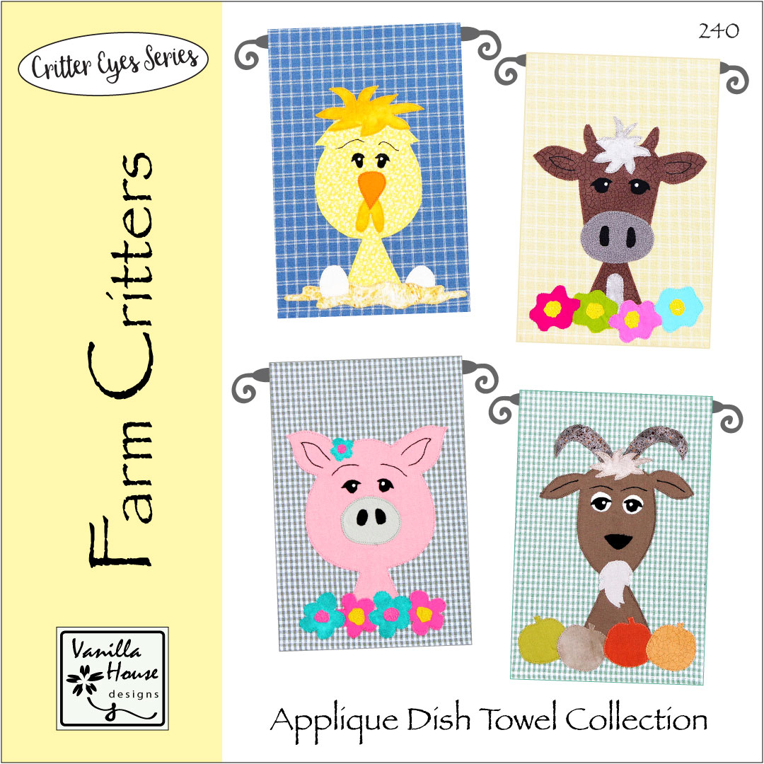 Pet Friend Critters includes four appliques for your pre-purchased dish towels, each critter with a list of cute sayings. Great tips on the raw-edge applique technique.